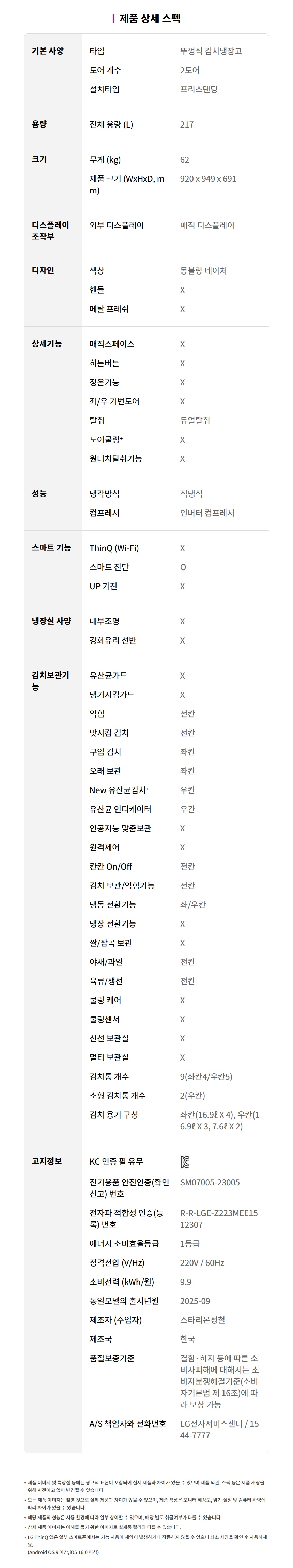 K225MB131 LG전자구독 [LG] 디오스 김치톡톡 김치냉장고 217L 몽블랑네이처 제품분류 김치냉장고 용량(총량) 200L이상 기능 뚜껑형 AS기간 렌탈기간내 최저 렌탈가 월 28,900 (렌탈가) 제휴카드 할인가 월 (렌탈가) 3년 4년 5년 6년 할인 제휴카드 보기 렌탈신청 장바구니