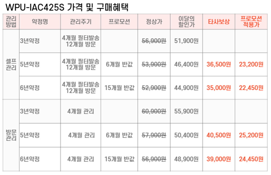 WPU-IAC425S SK매직 [SK매직] 원코크 플러스 얼음물 정수기 제품분류 정수기 정수방식 직수형 기능 얼음냉온 AS기간 렌탈기간내 최저 렌탈가 월 44,900 (렌탈가) 제휴카드 할인가 월 (렌탈가) 3년 5년 6년 셀프관리 방문관리/4개월 제품색상 선택 내츄럴화이트 + 0원 뉴트럴실버 + 0원 할인 제휴카드 보기 렌탈신청 장바구니