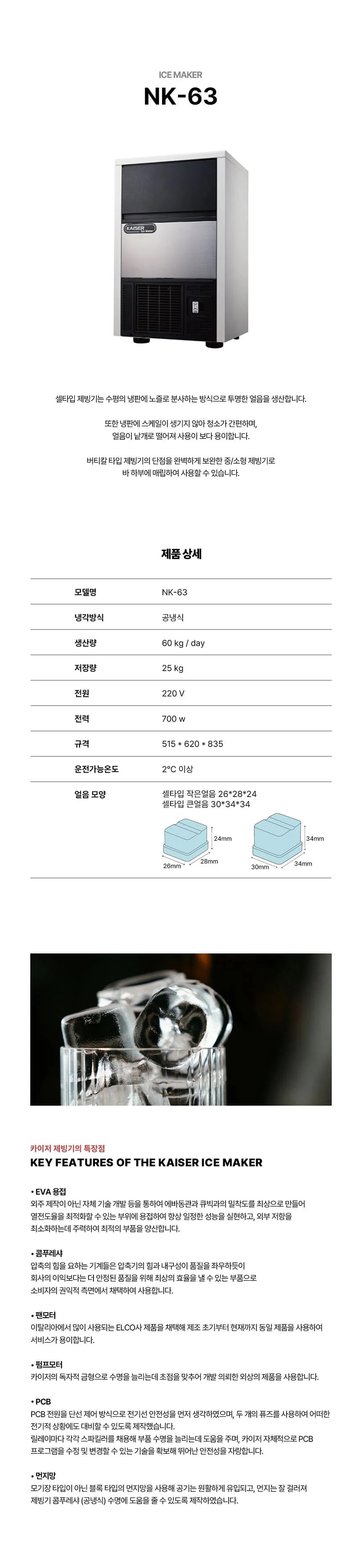 NK-63(작은얼음) 유버스 [카이저] 공랭식 작은얼음 제빙기 60kg 제품분류 제빙기 업소용 AS기간 1년 최저 렌탈가 월 68,200 (렌탈가) 제휴카드 할인가 월 (렌탈가) 3년 4년 5년 할인 제휴카드 보기 렌탈신청 장바구니