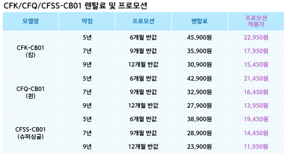 CFSS-CB01,CFQ-CB01,CFK-CB01 코웨이 [코웨이] 컴포트 프레임 (슈퍼싱글,퀸,킹) 제품분류 침대 AS기간 렌탈기간내 최저 렌탈가 월 23,900 (렌탈가) 제휴카드 할인가 월 (렌탈가) 5년 7년 9년 슈퍼싱글 퀸 킹 제품색상 선택 크림아이보리 + 0원 멜란지그레이 + 0원 테라코타오렌지(Q) + 0원 할인 제휴카드 보기 렌탈신청 장바구니