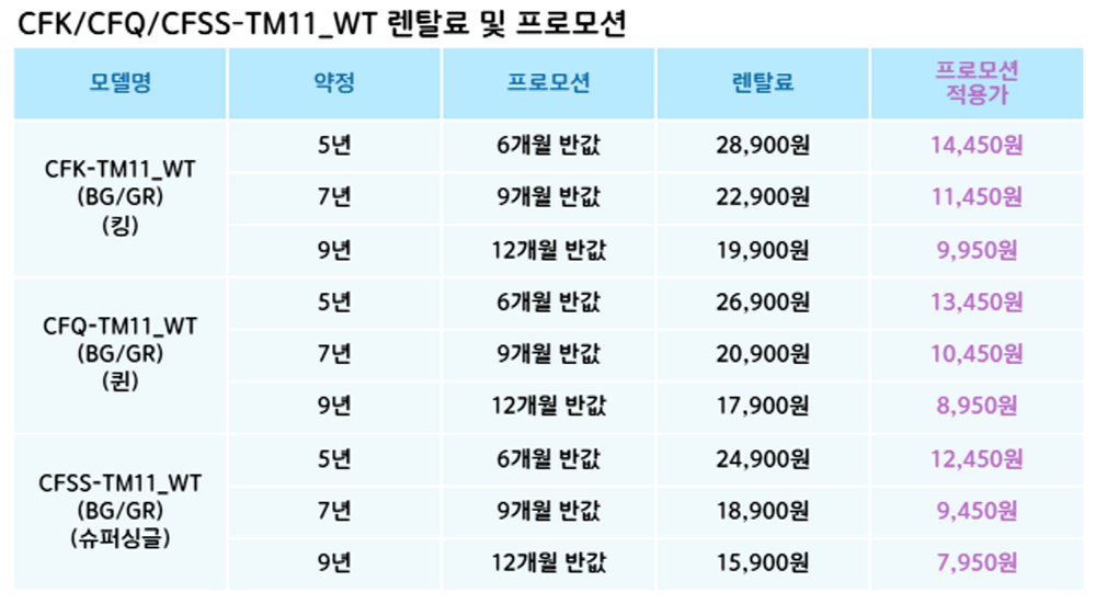 CFSS-TM11_WT,CFQ-TM11_WT,CFK-TM11_WT 코웨이 [코웨이] 비렉스 우디프레임 스노우화이트 (슈퍼싱글,퀸,킹) 제품분류 침대 AS기간 렌탈기간내 최저 렌탈가 월 15,900 (렌탈가) 제휴카드 할인가 월 (렌탈가) 5년 7년 9년 슈퍼싱글 퀸 킹 파운데이션 선택 오트밀베이지 + 0원 차콜그레이 + 0원 할인 제휴카드 보기 렌탈신청 장바구니